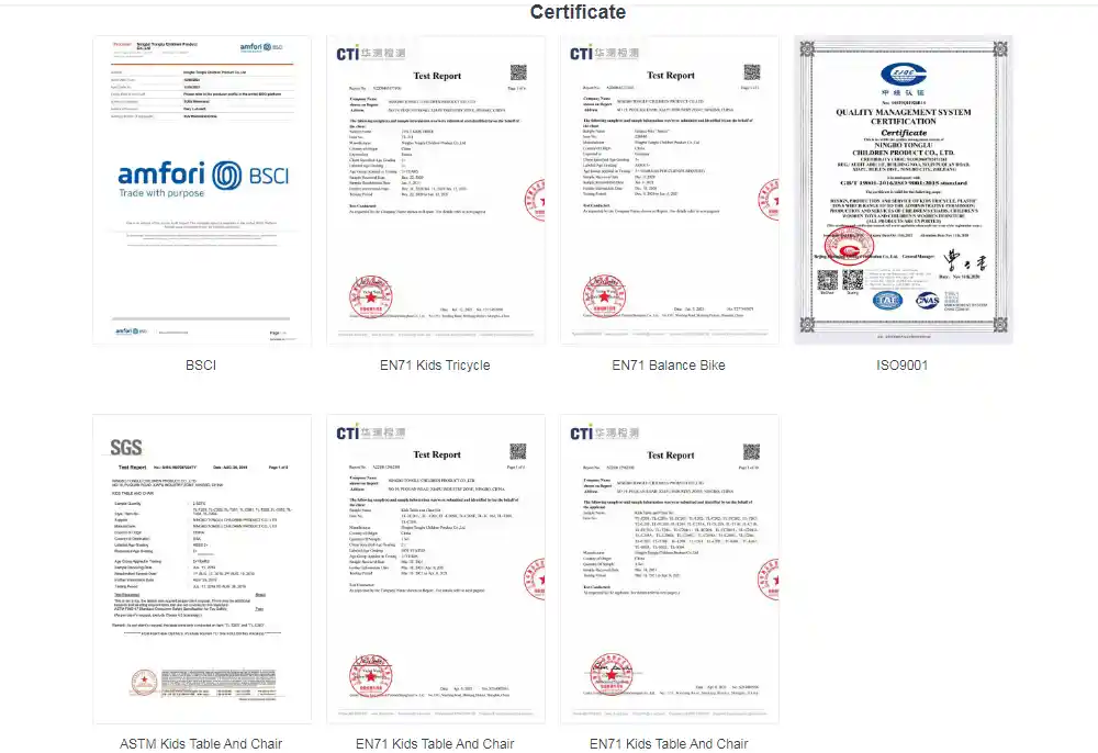 प्रमाणपत्रहरू जस्तैEN71रASTMसंकेत गर्छ कि हाम्रोबच्चाहरु र साना बच्चा trike सामग्रीहरू गैर-विषाक्त छन् कि छैनन्, कुनाहरूले हात काट्छन् कि छैनन्, र भागहरू बलियो छन् कि छैनन्, र सुरक्षा मापदण्डहरू पूरा गरेको छ कि छैन भन्ने सन्दर्भमा विशेष परीक्षणहरू पार गरेको छ।